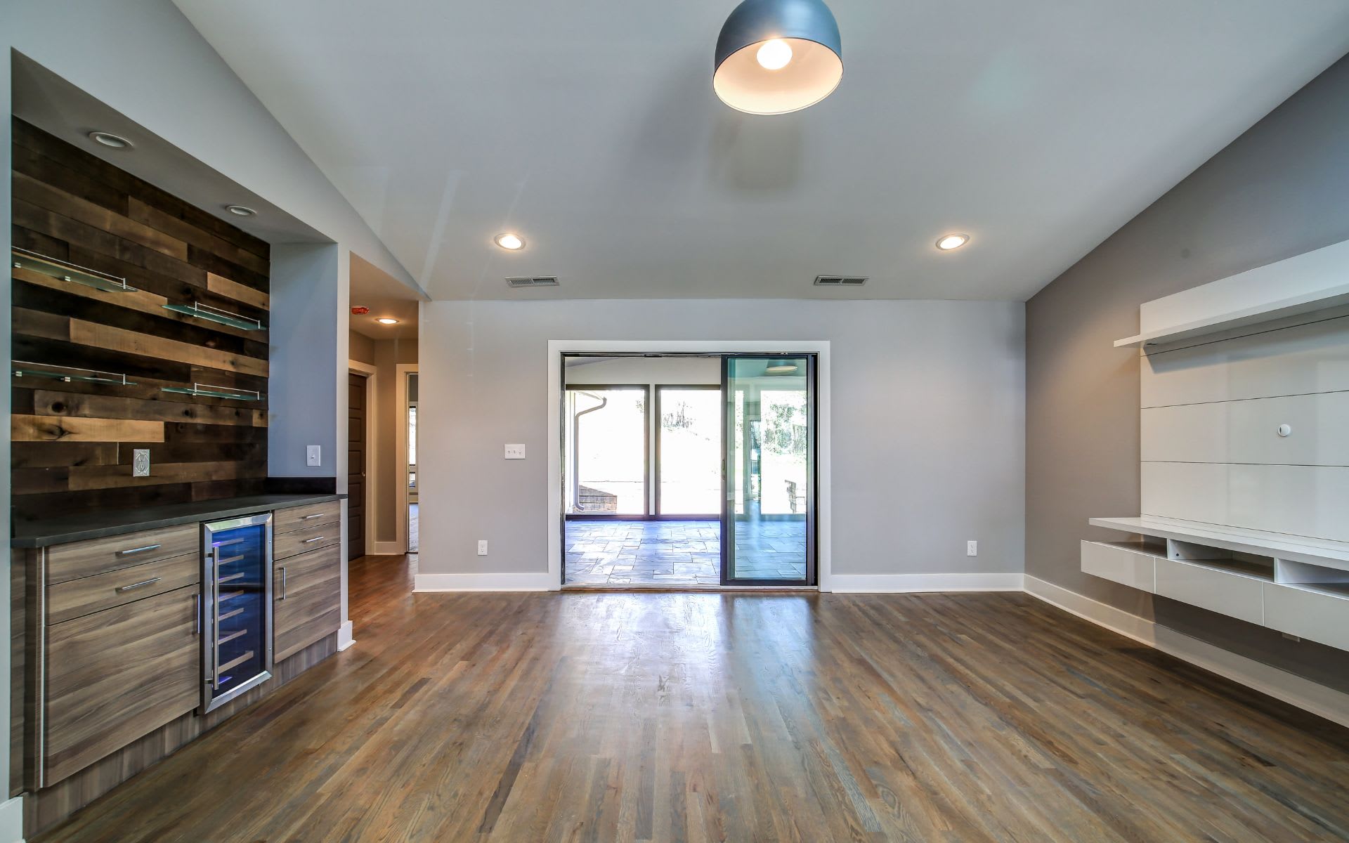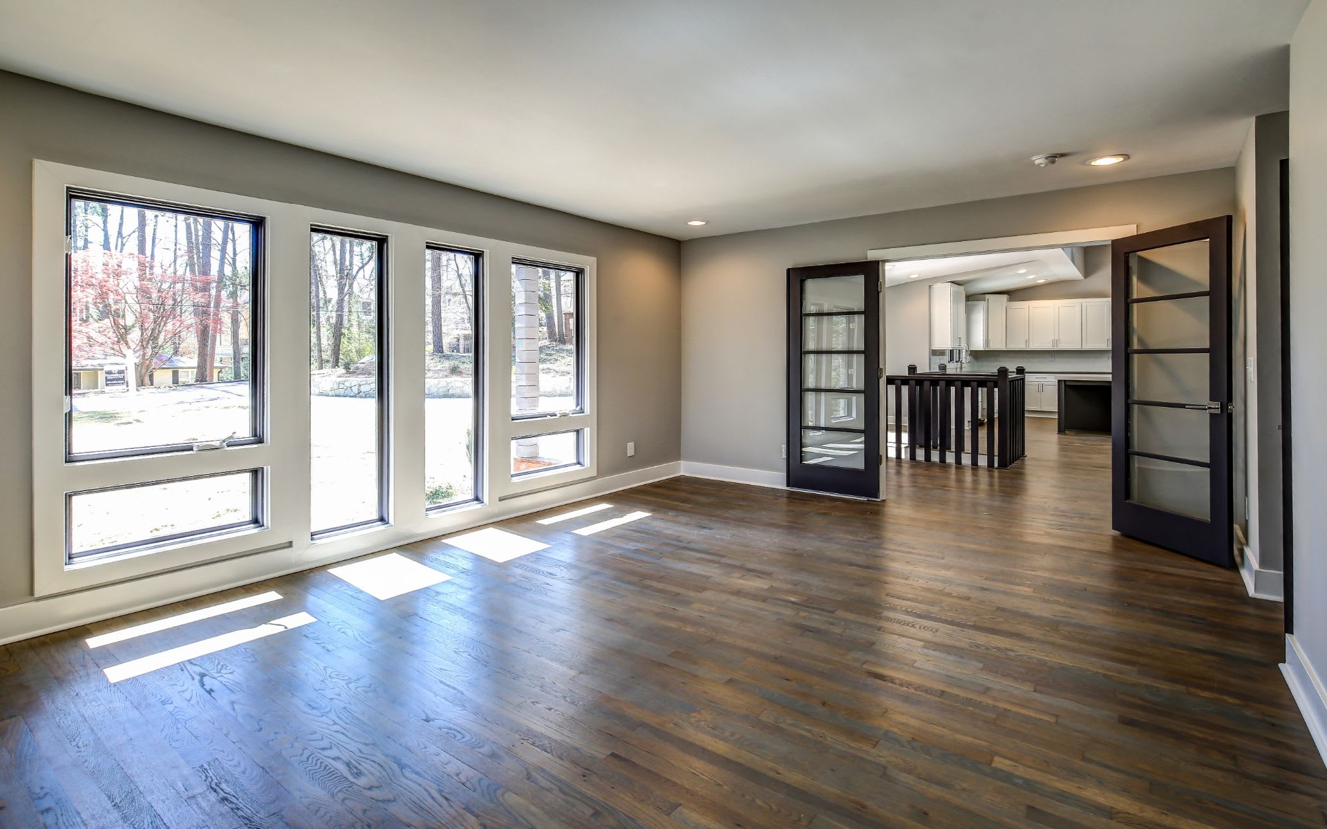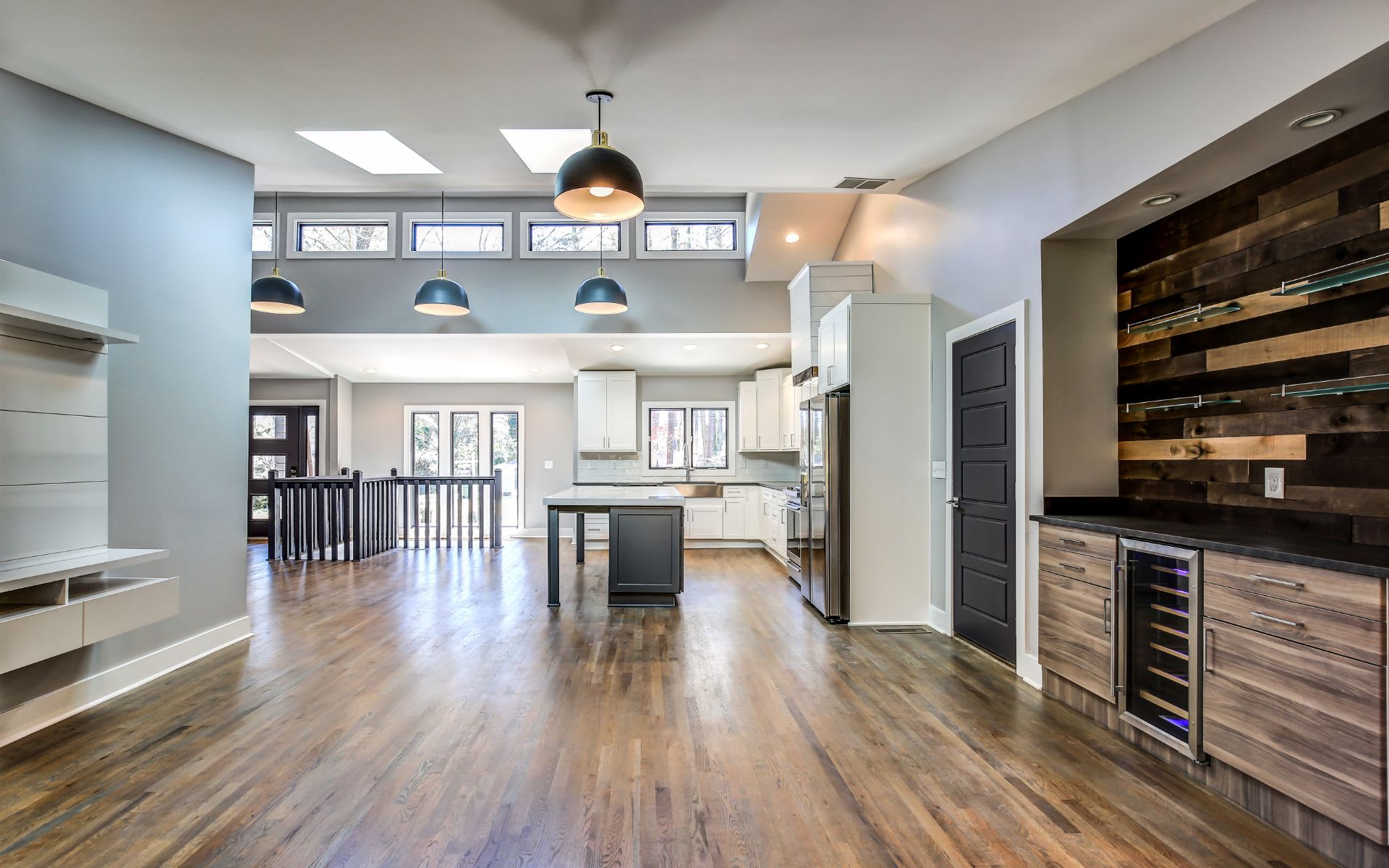 This is one of my favorite photos. It reveals the open floor plan, transom windows, wine bar, and gorgeous hardwoods.