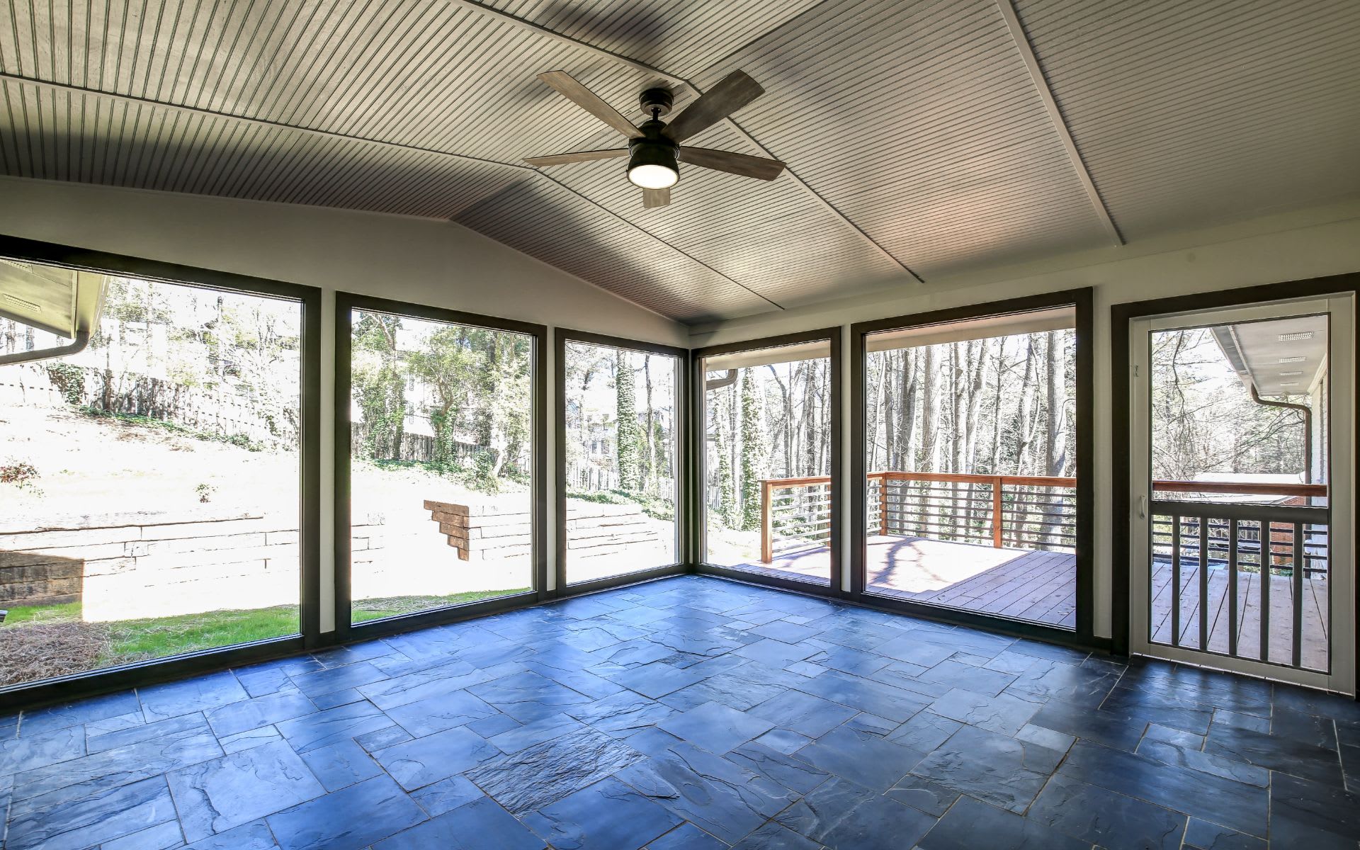 Triple sliding pocket glass doors leading out to screened back porch and deck.